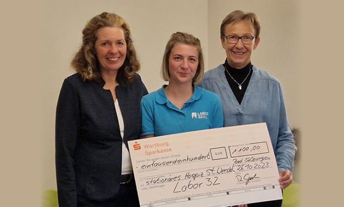 Am 26.10. übergab das Labor 32 mit Sitz in Barchfeld eine Spende in Höhe von 1.100,00 Euro. Zur Neueröffnung des Labors am 18.08.2023 wurde um Geldspenden anstatt Präsenten gebeten. Das Geld soll für den Hospiz-Neubau St.Wendel verwendet werden.